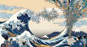 オリジナルでは遠近感を出すために、下3分の1に街灯や植木などが配置されている。上3分の2は街並みが重なる感じで描かれている。45°回転すると街並みが立体的に生成されているのがわかる。しかし四角形のオブジェクトがことごとく歪んでしまっている。また真横からの視点90°となると街灯が表示されているが、一段下にさがって描かれているようだ。つまりAIでは近くにあるという認識ではなく、一段さがった場所にあるという風に見ているようだ。