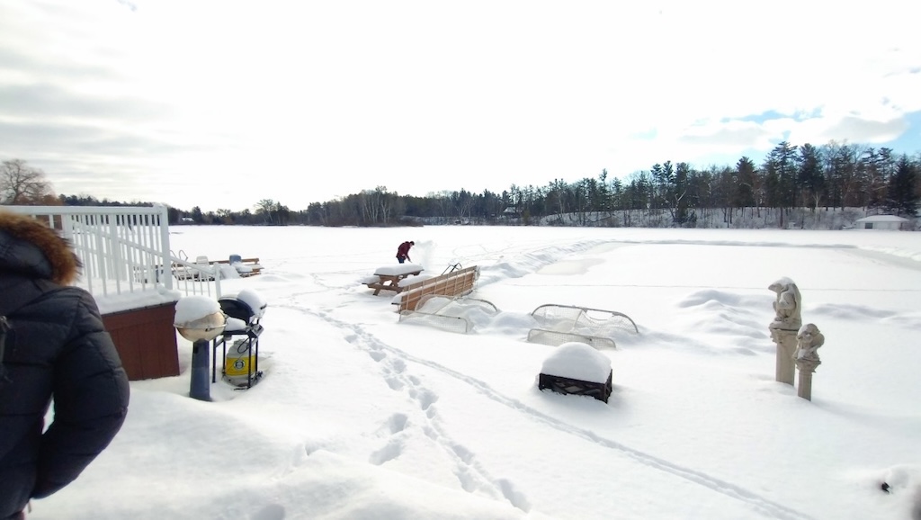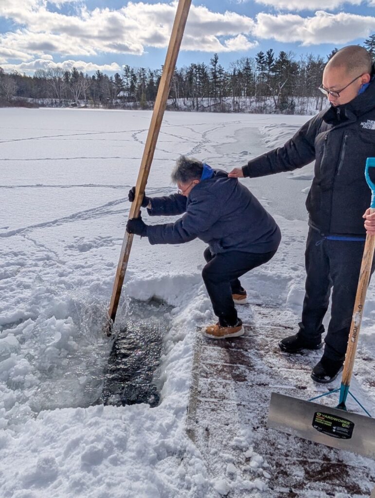 日本ではまず経験できない作業でしたから、「なるほど〜」と見ていたらチェーンソーがバッテリー切れ!その辺にある木の棒で氷を割る!雪かきをする!が実質最初の研修となりました。