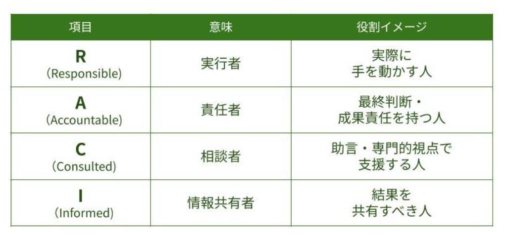 誰が実行して、誰が責任を持ち、誰に相談して、誰に共有するのか。