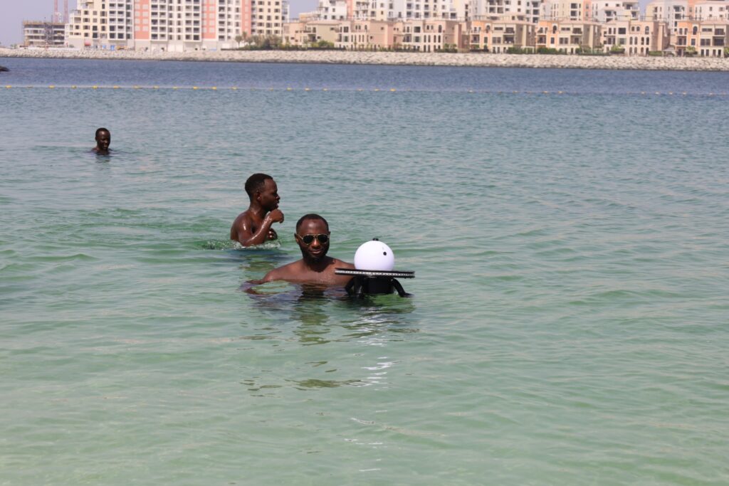 現地では、ARIVIAの新しいプロモーション素材として使用するための撮影も行い、スタッフの OTANI と OTEYAMA にミッションとして、半日かけてドバイの海やプールで ARIVIAのモック(試作モデル) の撮影をしてもらいました。