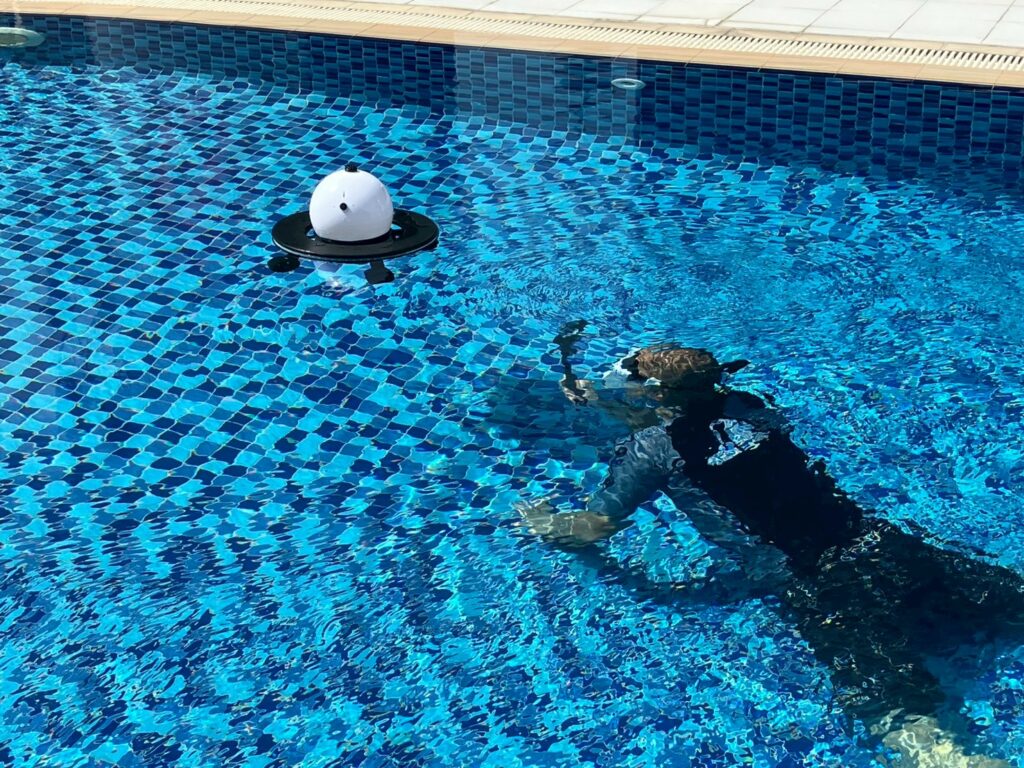 In the clear shallow water, the white hemispherical device floating on the surface begins to move smoothly across the water.