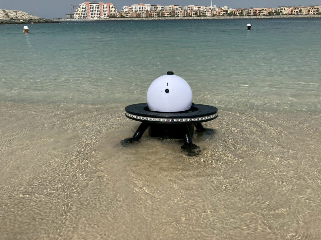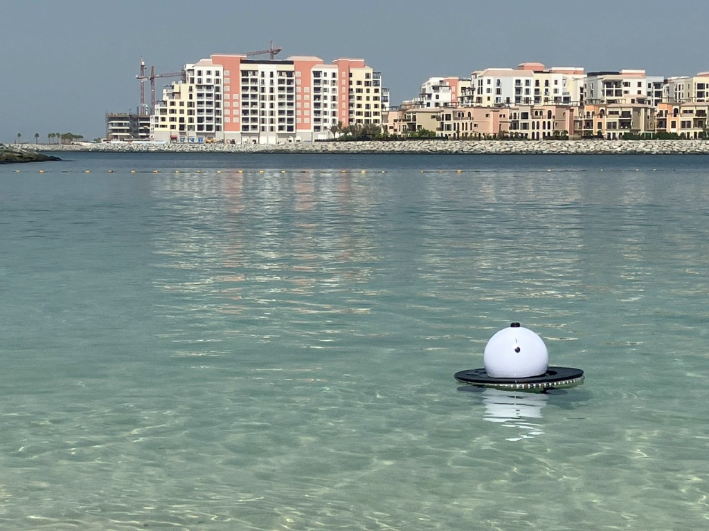 透き通った浅瀬の水面には、白い半球状の装置が浮かんでおり、水面を滑るように移動し始めます。