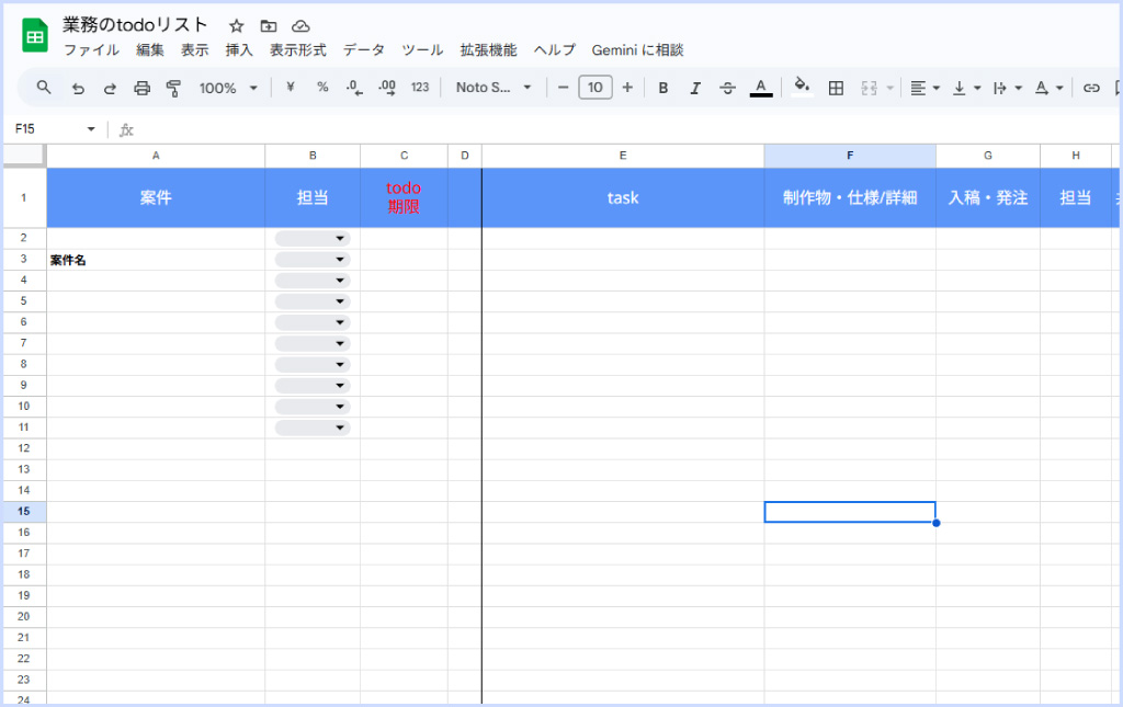 私の場合は、A列=案件名、B列=担当者の名前、C列=Todoの期限、D列=Todo書き出し済みの✓、E列=Todoの内容、F列=具体的仕様‥‥など必要な情報を記入できるように準備しました。