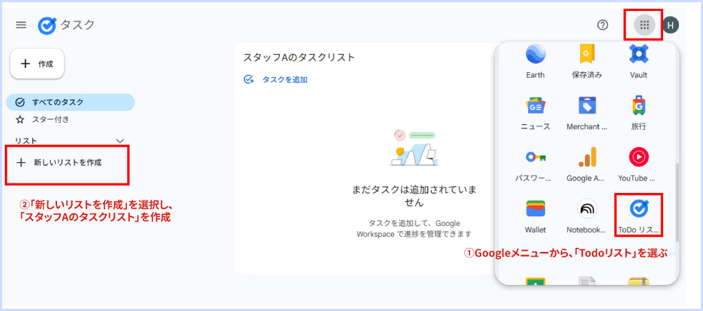 ②Googleの「タスク」に任意のタスクリストを作成する。