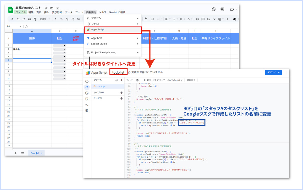 タイトルは任意に変更し(変更しなくてもOK)、90行目の「スタッフAのタスクリスト」を②のGoogleタスクで作成したリストの名前に変更する。