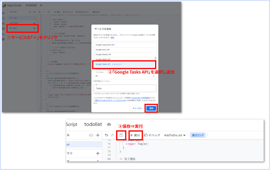 「サービス」の+ボタン⇒「Google Tasks API」を選択し、「追加」
