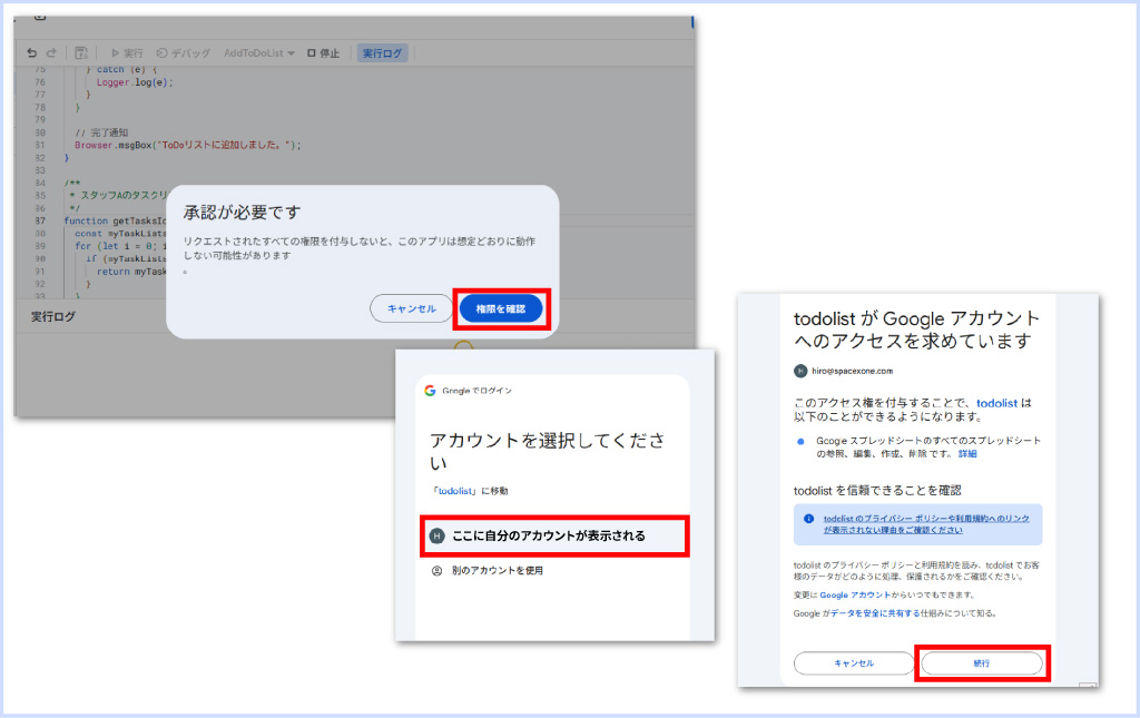 「承認が必要です」のポップアップから「権限を確認」を選択し、自分のアカウントを選択する。