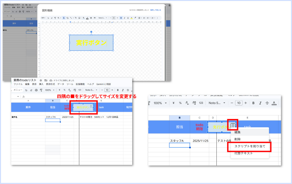 スプレッドシートに戻り、「挿入」⇒「図形描画」を選択し、ボタン用の図形を作る