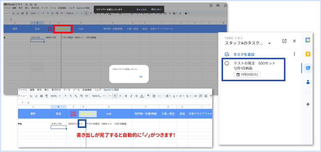 最後に「実行ボタン」をクリックし、自分のGoogleタスクに書き出しが完了すれば、スプレッドシートのD列に✓マークがつき、完了です。