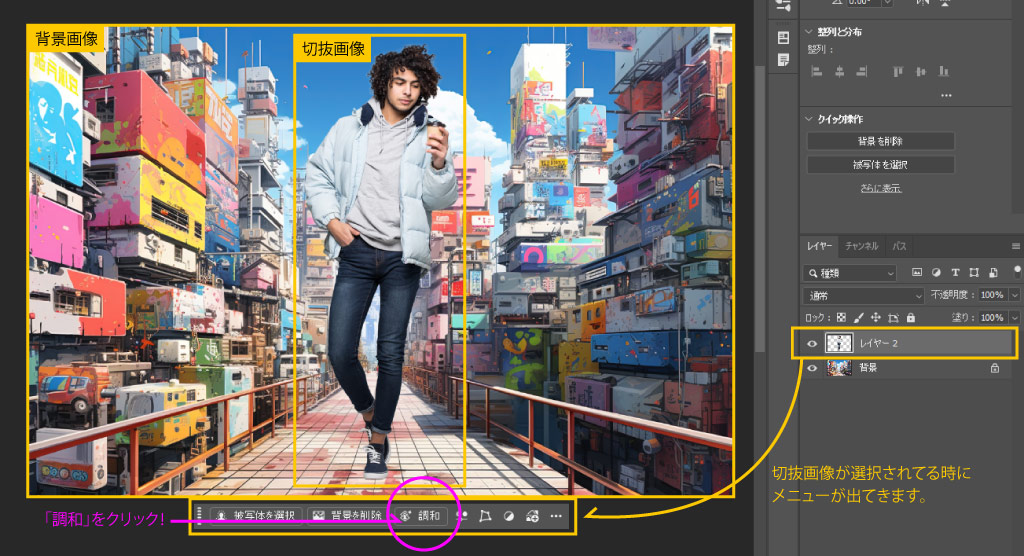 「調和」機能は、AIを活用した画像合成のための自動調整機能です。 合成した被写体が背景から浮いて見える違和感を解消するため、背景の色調や明るさ、光と影の雰囲気をAIが自動で分析。ワンクリックで、被写体の色味とライティングを背景へと自然になじませることができます。
