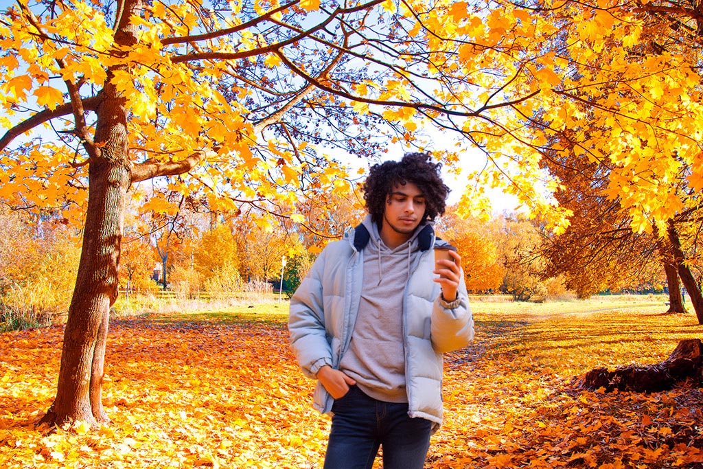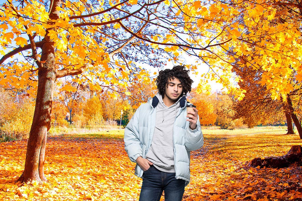 人物全体にオレンジ色の影が落ち、木々の葉や地面の落ち葉からの反射を自然と感じさせる色合いになった。