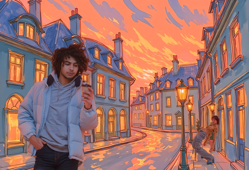 8.夕日や街灯が懐かしさを感じさせるイラスト